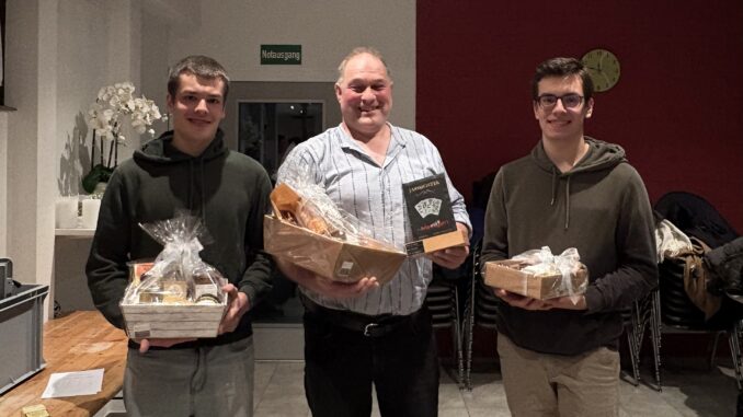 Am Freitag, 9. Januar 2026 fand der erste Anlass des Turnvereins Triengen im neuen Jahr statt – die Jassmeisterschaft. Gegen 20.00 Uhr trafen sich die Turnerinnen und Turner der Aktivriege sowie die Oldboys im Tennishaus Triengen. Nach einer feinen Portion Spaghetti ging es los mit dem Jassen oder auch mit einer Runde Brändi Dogg. Mit einem grossen Punktabstand konnte sich dieses Jahr Christian Flühler zum neuen Jassmeister krönen. Die Plätze 2 und 3 gingen an Linus Fries und Silas Fries. Anschliessend klang der Abend bei weiteren kleinen Spielen und Gesprächen gemütlich aus.